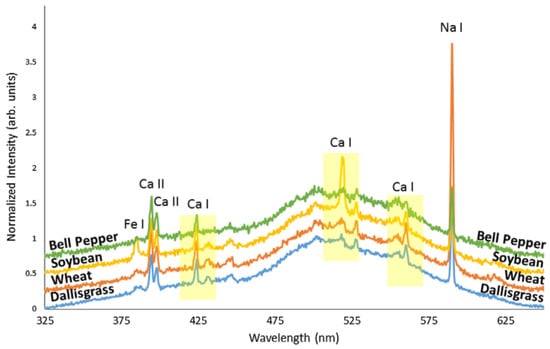 To verify accuracy, five certified reference materials from the National Institute of Standards and Technology (NIST), including SRM 1570a (trace elements in spinach leaves), were tested. Figure 4 illustrates the optical response from nanosecond and femtosecond lasers in two spectral windows for one of these samples. In 2017, another study employed fs-LIBS for analyzing various plants, including dallisgrass, wheat, soybean, and bell pepper leaves [145]. Kunz et al. [145] used LIBS to identify plasma temperatures and to differentiate plant species. Figure 5 depicts the normalized and offset emission spectra of all four samples in order to provide something that allows comparison. They determined LIBS could distinguish crops from weeds due to relatively consistent differences in plasma temperatures among analyzed samples. Further, the authors observed an indirect proportional relationship between plasma temperature and the composition of the plant. Different plants require different energy levels of excitation and ionization depending on their elemental and compound content. Therefore, the plasma temperature and peak ratios produce a distinctive plant signature.