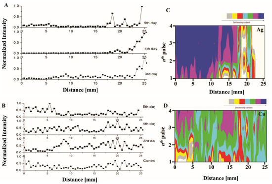 An example is the work Krizkova et al. [98], who employed the second harmonic of a Nd:YAG laser system with a wavelength of 532 nm. They performed the analysis by placing the samples on a holder inside the ablation chamber, achieving a spatial resolution of 2 μm in all three directions (x, y, and z) using a high-precision motorized translation stage. A CCD camera outside the chamber was used to control the ablation point on the sample, enabling the measurement of the time evolution of the distribution of silver and copper in different parts of the plant stem. The authors demonstrated the possibility of obtaining high-resolution elemental maps of the samples monitored using LIBS. Furthermore, they showed that the total amount of silver and copper accumulated on the plant stem exhibited similar behavior, although their spatial distribution differed (Figure 7). A few days after the treatment, silver accumulated closer to the root of the sample (Figure 7A), while copper accumulated uniformly throughout the stem (Figure 7B). Figure 7C,D represent the relevant maps of gathered silver and copper resulting from the in-depth LIBS analysis of the stem samples.