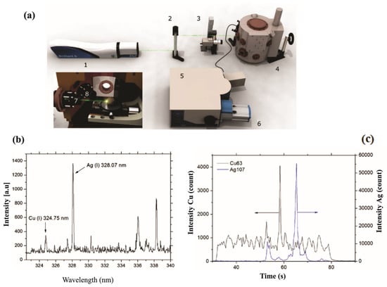 Instrumentation: (a) 1—Nd:YAG laser source, 2—periscope, 3—CCD camera to align a target, 4—experimental chamber, 5—monochromator, and 6—ICCD camera. In this set-up, the inner section of the chamber has a stage with micro-displacement: 7—focusing and 8—gathering optics. Experimental results: (b) The LIBS spectral emission of Ag(I) at 328.07 nm, and Cu(I) lines at 324.75 nm, and (c) the signal of Ag and Cu obtained by LA-ICP-MS technique. Reproduced from ref. [99] with the permission of Springer.