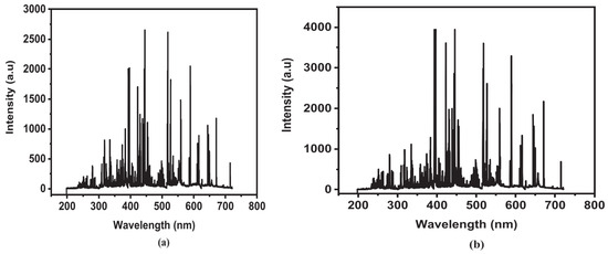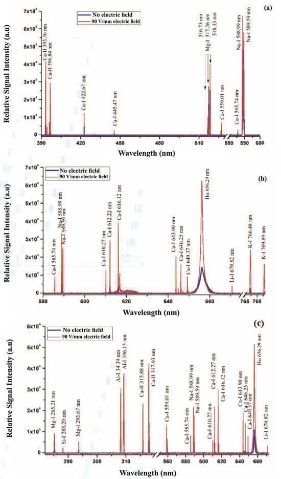 Jabbar et al. recently published a study on the application of LIBS in the analysis of plants, agricultural, and herbal products [149]. The samples used in this research were Aerva javanica, collected from a salt mine 160 km south of Islamabad in Pakistan. The laser system used in the experiment consisted of a Q-switched Nd:YAG laser with a wavelength of 532 nm, a pulse energy of 120 mJ, a pulse width of 5 nanoseconds, and a repetition rate of 10 Hz. Figure 9a shows the LIBS spectrum of the soil samples selected as targets, in the wavelength range from 300 to 600 nm. Figure 9b represents the emission spectrum of the roots of the Aerva javanica plant in two wavelength ranges: from 580 to 675 nm and from 765 to 770 nm. Figure 9c illustrates the spectrum emitted from the shoot of the Aerva javanica plant. The wavelength ranges in this case were from 282 to 675 nm and from 766 to 770 nm. The major contribution of this paper was to estimate the percentage of soluble salt metals in all three samples: stem, root, and soil of the Aerva javanica plant. One of the most important results reported in this paper was the demonstration that when LIBS is associated with an electric field, the soluble metal salts signal in soils, water and agricultural samples is enhanced (Figure 10), which yielded a better and more sensitive analysis.