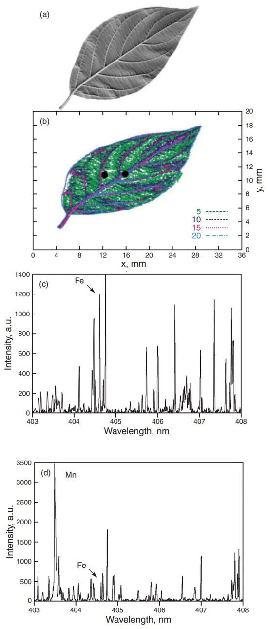 They also demonstrated that it is possible to clearly distinguish the leaf veins from other areas of the leaf. As a result, the spatial distribution of the iron element in the leaves was preserved, which is a significant advantage of LIBS analysis compared to other traditional methods. In LIBS, the ablation process is performed without destroying other parts of the plant sample. This makes it possible to survey and analyze any plant parts with low side effects. Additionally, the method has high spatial resolution which can recapture spatial information with regard to where various elements are distributed across plant parts. Other often used methods may lose some of this information with sample preparation.