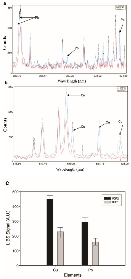 The authors argued that since metals are either deposited on plant tissues or absorbed by plants, fs-LIBS could be applied to plant tissues as an indicator of air pollution. Consequently, they qualitatively ranked the sites of leaf collection from the most polluted (largest concentration of trace metals) to the less polluted (smaller concentration of trace metals). Furthermore, they pointed out that fs-LIBS could be applied to analyze soils from different regions to assess their quality, pollution levels, and elemental composition. It can also be used in botanical research to measure the elemental content in plant tissues and assess environmental stress.