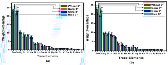 Tripathi et al. [124] investigated the distribution of silicon and minerals in various sections of wheat (Triticum aestivum) plants using phytolith analysis LIBS. The LIBS analysis detected the presence of elements such as Ca, Mg, Si, Fe, Na, K, C, H, O, and N. In contrast, the phytolith analysis revealed that the leaves of wheat plants contained the highest silicon accumulation, followed by the awn, leaf sheath, lemma, rachilla, and stem. A strong concordance was observed between the results of the two methods. Figure 1 depicts the intensity ratio distribution versus elements: (a) various elements and (b) Si normalized to C, across different parts of the wheat plant.