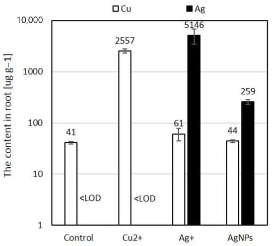 The two-pulse LIBS configuration was employed by Krajcarová et al. [131] to study the root tissues of Vicia faba (broad bean). This plant was chosen for its robust primary root structure, which facilitates the preparation of cross-sections and allows for the spatial distribution analysis of Ag nanoparticles in different root sections. Their study suggested that Ag nanoparticles were restricted to the outermost root layers and did not penetrate inner tissues. Figure 6 shows the LIBS spectrum of a root cross-section. In this spectrum, there were two notable observations: when roots were grown in solutions with similar concentrations of silver and copper ions, the peak intensities of copper were much larger than those of silver. This is a crucial consideration for studying silver in plants with LIBS technology since it is especially important for its toxicity to plants and its absorption by the plant depends on its soil concentration. As LIBS allows us to identify silver and other elements in plant tissues positively, it will enable us to understand their ecological and toxicological impact.