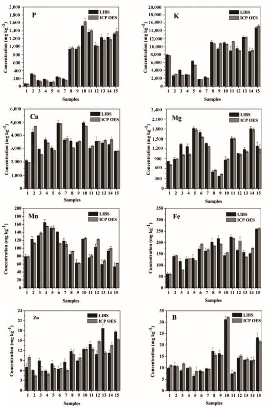 Pouzar et al. [83] used LIBS technology to identify the macronutrient elements Ca, Mg, P, and K in the leaves of plants such as wheat, poppy, barley, and rapeseed. Their aim was to develop a fast and cheap alternative to conventional laboratory instrumentation, with minimal sample preparation, for the analysis of crop plant samples. The amounts of potassium and magnesium were evaluated using LIBS by Silvestre et al. [150]. In this study, the samples were prepared by adding high concentrations of these elements to wood, filter paper, and babassu fruit. The samples used in the research included wood samples (Pinus), powdered babassu mesocarp (Esmeraldo Produtos Naturais, Fortaleza, Brazil), filter paper (Whatman 513, 15 mm), and plant samples (apple leaf SRM 1515, peach leaf SRM 1547, and tomato leaf SRM 1573a, NIST, Gaithersburg, MD, USA). These samples were used to determine synthetic calibration standards, considering the large variation in Mg and K concentrations during sample preparation.