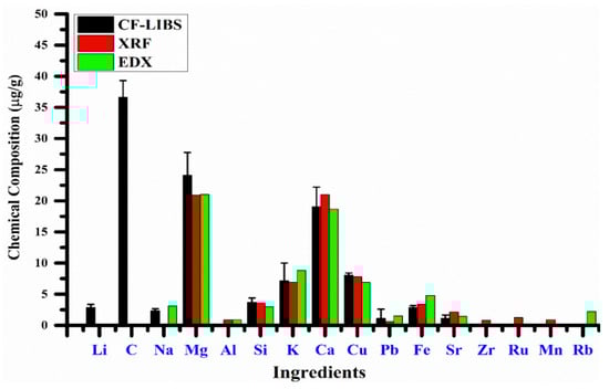 Additionally, Andrade et al. [123] used LIBS and ICP-OES to evaluate the trace and toxic metal content in medicinal herbs, identifying elements such as Ca, Cd, Cr, Mg, Mn, Fe, Co, Cu, Na, Pb, Ni, and Zn.