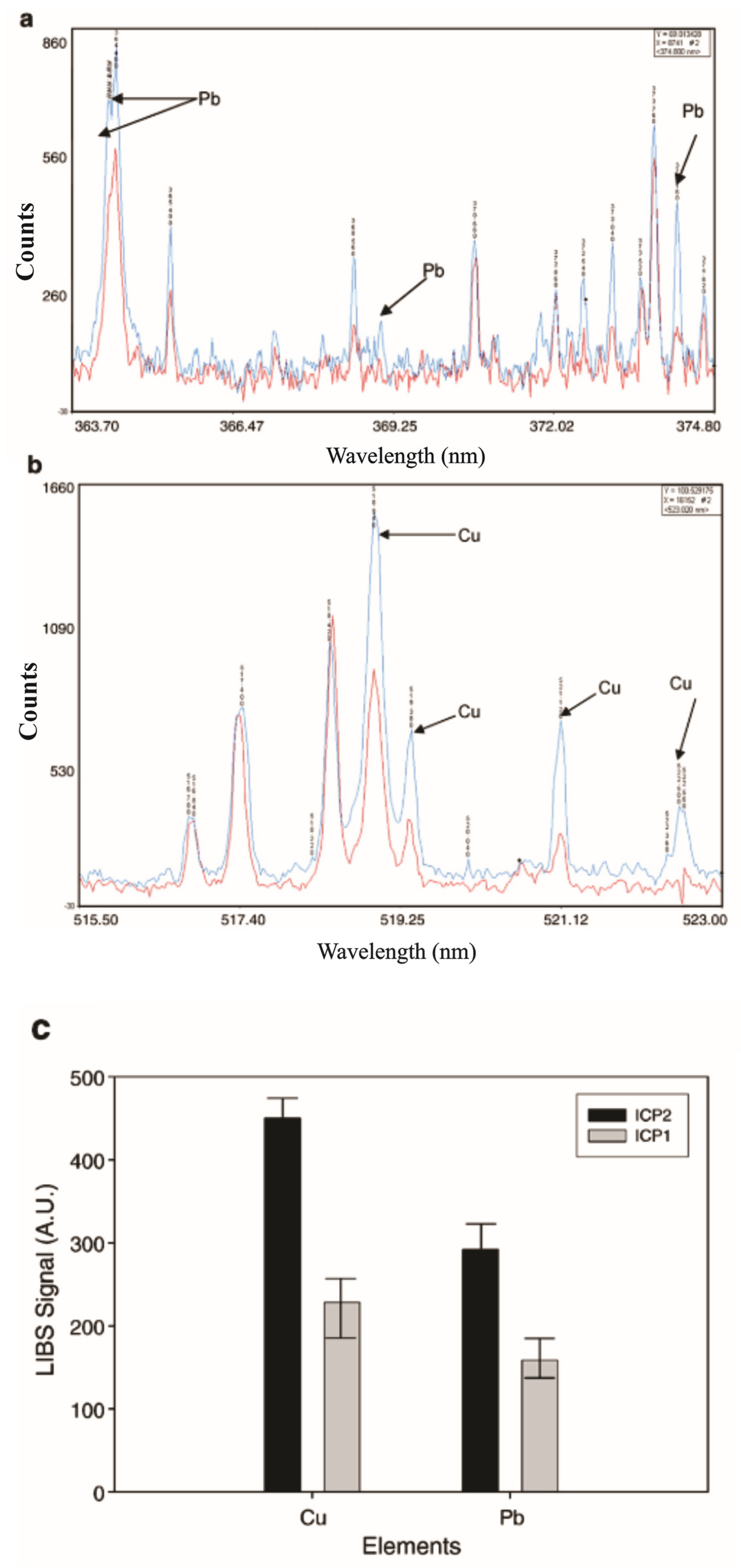 | 2009 | Helianthus annuus, part of leaves | Pb, Mg, Cu | SP-LIBS: Nd:YAG (532 nm), 10 mJ per pulse | Laser-Ablation Inductively Coupled Plasma Mass Spectrometry (LA-ICP-MS) | dried and partially dried leaves | [97] |