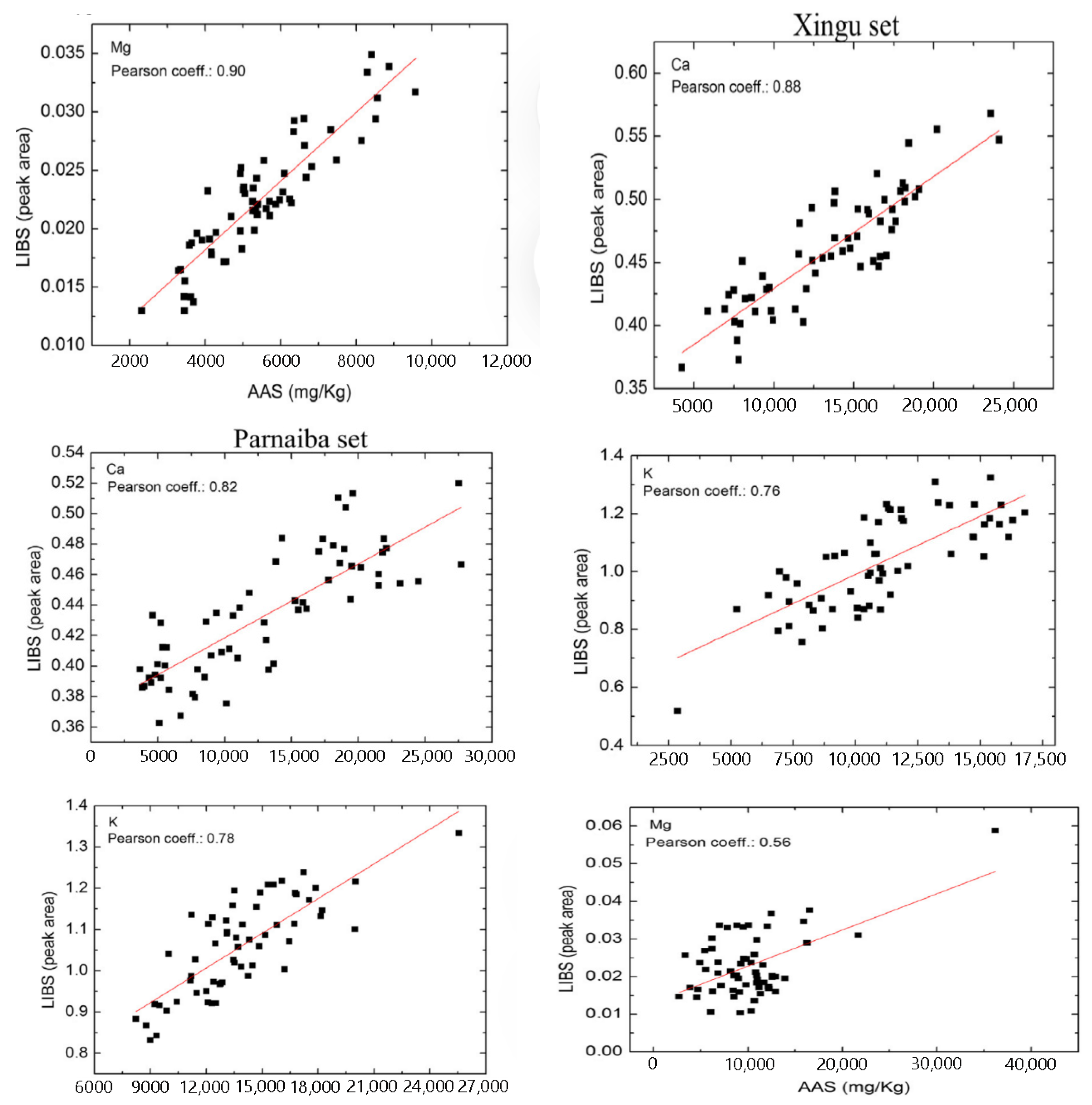 | 2008 | CRMs, and leaves of Brachiaria, soya, banana, coffee, jack, maize, pepper, guayava | Ca, K, Mg, P | SP-LIBS: Nd:YAG (1064 nm), 10 Hz, 200 mJ/pulse, 23 J·cm−2, 4.6 W·cm−2, 8 pulses, 2 µs td, 5 µs tint | ICP-OES | drying, cryogenic grinding and pelletizing | [63] |