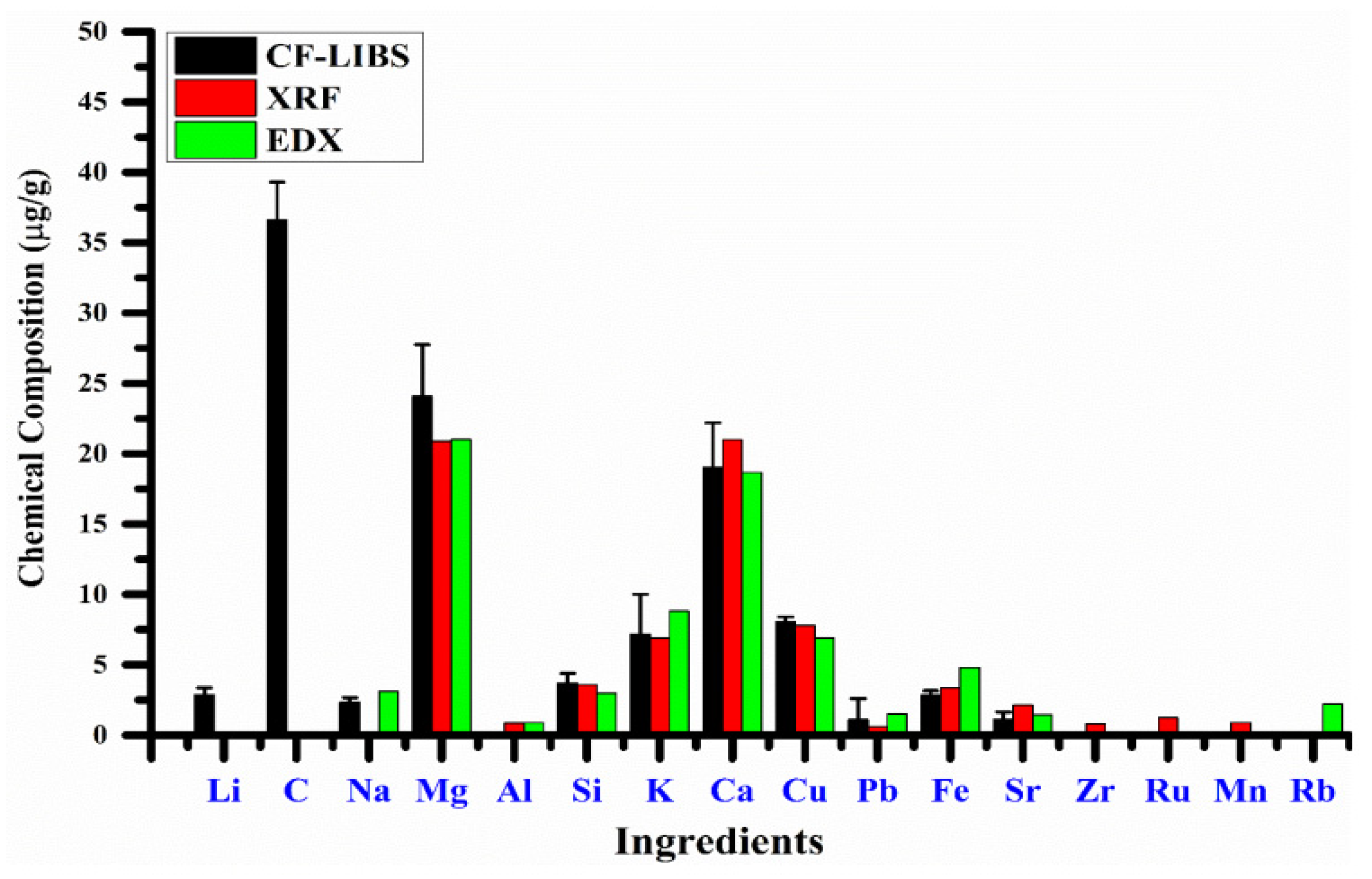 | 2015 | Saccharum spp. Leaves | Fe, Mn, B, P, Si, Ca, Mg | SP-LIBS: Nd:YAG (1064 nm), 50 J·cm−2 | Energy-dispersive X-ray fluorescence spectrometry (EDXRF) | fragments from dried middle-third leaves | [55] |