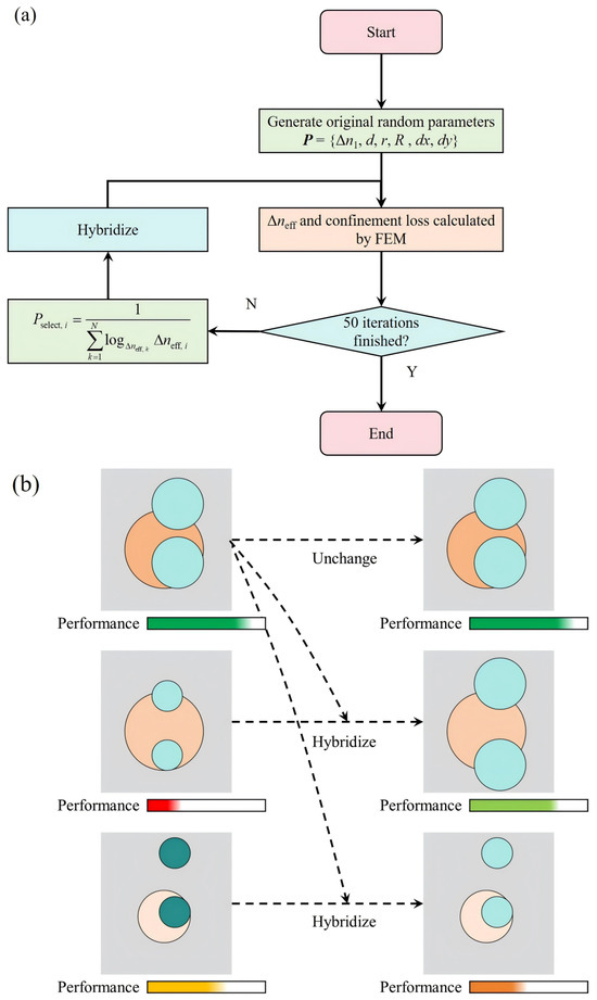 Optimization of the proposed fiber structure using a genetic algorithm. (a) Flowchart of the optimization process; (b) schematic illustration of the crossover mechanism.