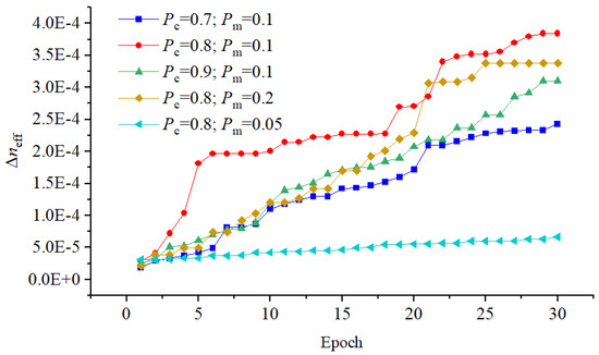 The fitness function was defined as , where represents the minimum effective index difference among the first ten guided modes. This logarithmic formulation enhances sensitivity when is small, thus improving the convergence behavior of the optimization. An elitist strategy was employed throughout, guaranteeing that the best-performing individual in each generation was directly carried over to the next. The GA operated with a population size of 200 and was executed for 30 generations, providing a sufficient balance between exploration and convergence efficiency.