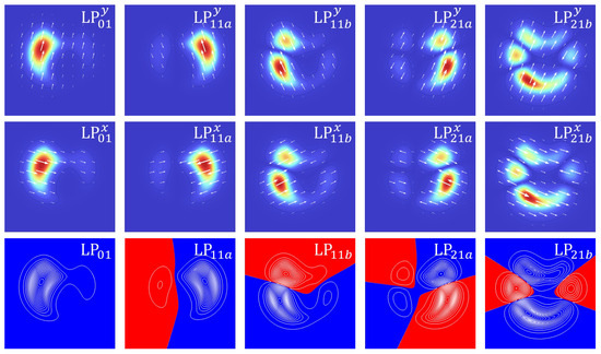 Figure 4 presents the mode profiles and corresponding phase distributions of the ten guided polarization modes supported by the optimized fiber. Each eigenmode is clearly distinguishable by its distinct field localization pattern and phase periodicity, confirming the successful suppression of mode degeneracy and the preservation of high polarization purity. The orthogonality of the obtained vector modes further validates the structural symmetry and numerical stability of the optimized design.