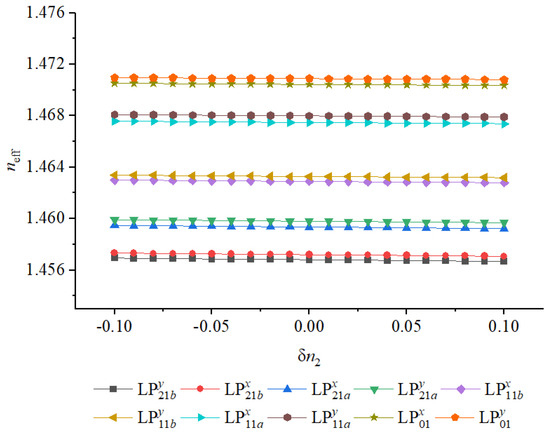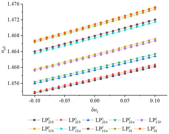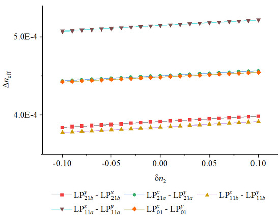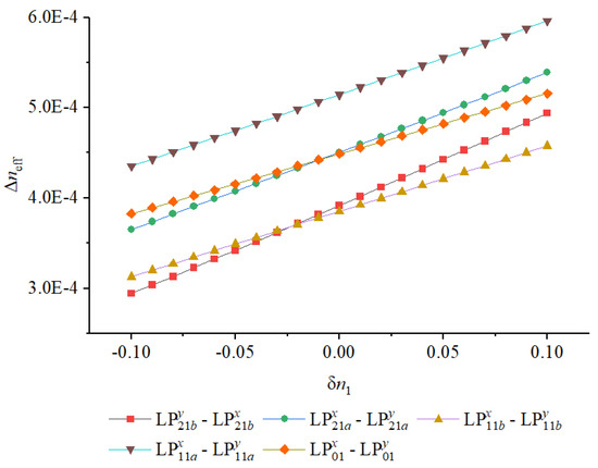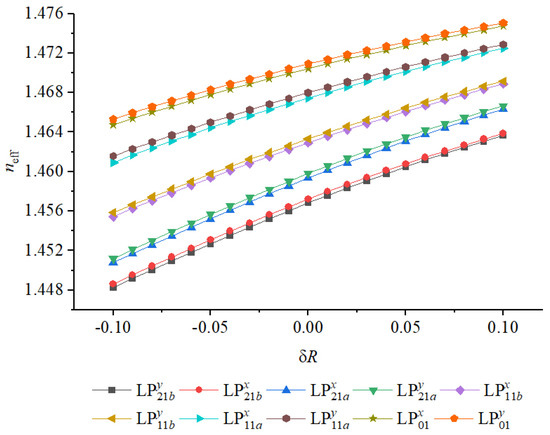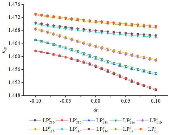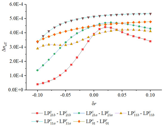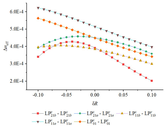 We first examine variations in the relative error in refractive index ratio () and radius (R) of the high-index core, denoted by and , respectively. As shown in Figure 6 and Figure 7, increasing results in higher values across all guided modes, which can be attributed to the stronger refractive index confinement and enhanced optical guiding capability. Conversely, reducing weakens the refractive index contrast, thereby diminishing modal confinement and reducing the effective separation between neighboring modes. In particular, at , the minimum drops to , with degeneracy observed between the two orthogonally polarized components of the mode. This trend highlights that small inaccuracies in doping concentration or refractive index control during preform fabrication can directly influence birefringence and inter-modal discrimination.