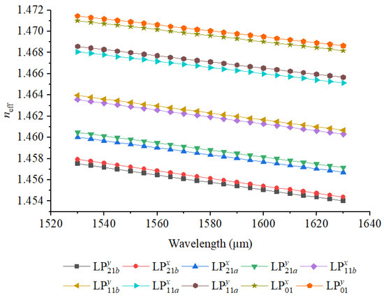 Variation of effective refractive indices with wavelength for all guided modes in the optimized structure.