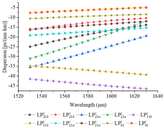 Variation of dispersion with wavelength for all guided modes in the optimized structure.