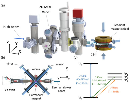 Among the various approaches, the two-dimensional magneto-optical trap (2D MOT) has emerged as a particularly promising solution, owing to its compact structure and efficiency as an atomic source [15,16,17,18,19]. This approach effectively circumvents the technical limitations associated with traditional methods such as the Zeeman slower [20,21], including vacuum contamination and interference from blackbody radiation generated by high-temperature ytterbium ovens. While the 2D MOT offers advantages in compactness and efficiency, it delivers relatively low atom flux to the 3D region. This makes it difficult to directly observe atomic fluorescence and reliably determine whether the push beam has successfully transferred atoms from the 2D to the 3D region. This confirmation is crucial for the successful implementation of narrow-line three-dimensional magneto-optical trap (3D MOT). To address this challenge, the broad-line 3D MOT offers a viable solution, while certain experimental aspects of this approach remain insufficiently explored.