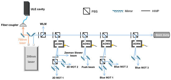 The optical path system is schematically presented in Figure 2. There are 2D MOT cooling beams, a Zeeman slower beam, a push beam and blue MOT trapping beams. The laser frequency is locked at a detuning of −109 MHz from the 1S0 → 1P1resonance transition; the 2D MOT trapping beams are frequency-shifted by the first-order diffraction of an acousto-optic modulator (AOM) driven at +74 MHz, corresponding to a detuning of −35 MHz. The Zeeman slower (ZS) beam shares the same AOM with the 2D MOT trapping beams and uses the zeroth-order diffracted beam, producing a detuning of −109 MHz. The push beam is modulated by an AOM at +109 MHz, matching the resonant frequency. Both the horizontal and vertical trapping beams of the 3D MOT are shifted by AOMs operating at +80 MHz, resulting in a detuning of −19 MHz. An ultra-low-expansion (ULE) cavity was employed to lock the fiber laser [22]. The fineness of this cavity is approximately 1500, and the free spectral range (FSR) is 1.5 GHz; this exhibits a full width at half maximum (FWHM) of the cavity resonance for near ∼1 MHz. Compared with the wavelength meter locking scheme, the laser frequency locked to the cavity is more stable due to smaller drift. This study also employed a 556 nm laser as a push beam to examine its influence on the atom loading rate. Like the blue laser locking scheme, the 556 nm laser system was also frequency-stabilized by another ultrastable optical reference cavity (stable laser systems).