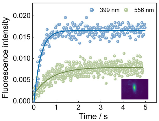 Loading curves for the 399 and 556 nm light as push beams. The corresponding atomic loading rates are 0.78 × atoms/s and 0.15 × atoms/s respectively. The solid line represents the fitting result based on the formula given in the text. The inset shows the atomic fluorescence image under low magnetic field condition.