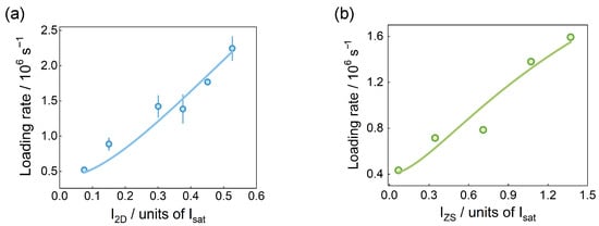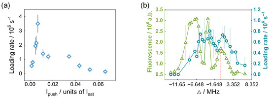 For the 399 nm push beam, the loading rates are maximized around 0.01 ( = 60 mW/cm2), with higher powers resulting in lower loading rates (Figure 5a). This behavior occurs because larger push beam intensities result in the finite capture efficiency of longitudinal velocities beyond the capture velocity. Consequently, when the push beam intensities exceed a certain threshold, the atomic loading rate decreases.