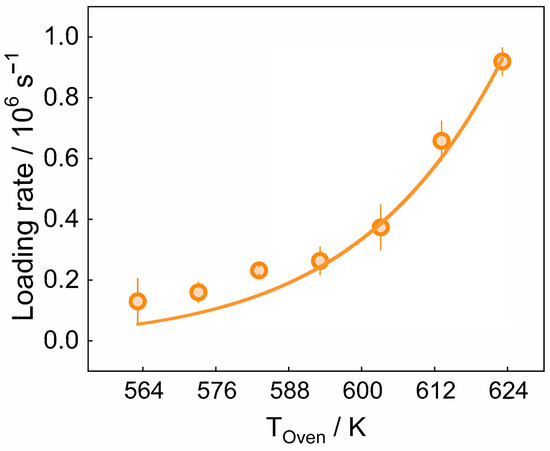 Effect of oven temperature (Kelvin temperature) on loading rate. Circles and the solid line represent the experimental data and corresponding exponential fit, respectively. The other parameters are = 1.365, = 0.338 and = 0.002 .