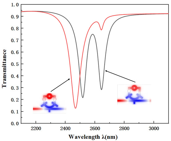 As illustrated in Figure 2, the red curve corresponds to the symmetric structure formed by coupling the continuous mode of the MIM waveguide with the discrete mode of the U-shaped resonator. Its transmission spectrum exhibits a single broad resonance peak with a FWHM of approximately 100 nm and very high transmittance. In contrast, the black curve represents the asymmetric U-shaped resonator structure, which displays a doublet peak profile in the emission spectrum. This line shape originates from the coupling between two adjacent discrete states and the broadband continuum. The asymmetric resonator yields a more sharply defined resonance, accompanied by a larger resonance wavelength shift, higher sensitivity, and an excellent FOM. For the transmission spectrum with bimodal characteristics, the full width at half maximum (FWHM) was determined by treating the lower-intensity peak as an isolated single peak. The calculation was performed by taking the wavelength difference between the left and right points at half-maximum of the respective peak.