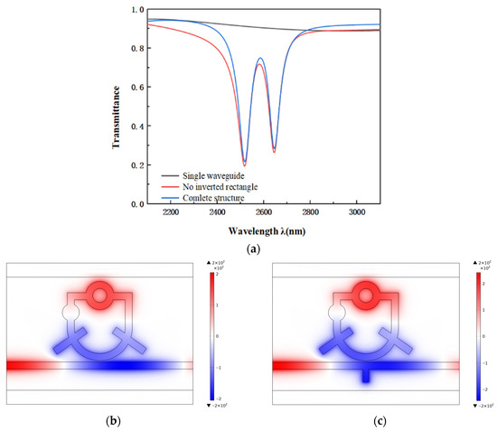 (a) Transmission spectra of the structure without the inverted rectangular stub and the complete structure; (b) magnetic field distribution of the structure without the inverted rectangular stub; (c) magnetic field distribution of the complete structure.