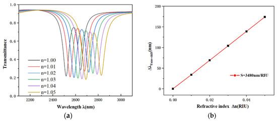 In order to investigate the effect of different refractive indices on the structural performance, a series of discrete values, namely 1.00, 1.01, 1.02, 1.03, 1.04, and 1.05, were selected as control parameters. A comprehensive comparative study was conducted on the results under all these refractive index conditions. As observed in Figure 4a, as the refractive index n increases, the overall shape of the transmission spectrum remains consistent, while the peak position exhibits an approximately equidistant red shift without significant alteration in the spectral profile. Figure 4b demonstrates that the observed wavelength shift follows a strong linear relationship with the change in refractive index (n).