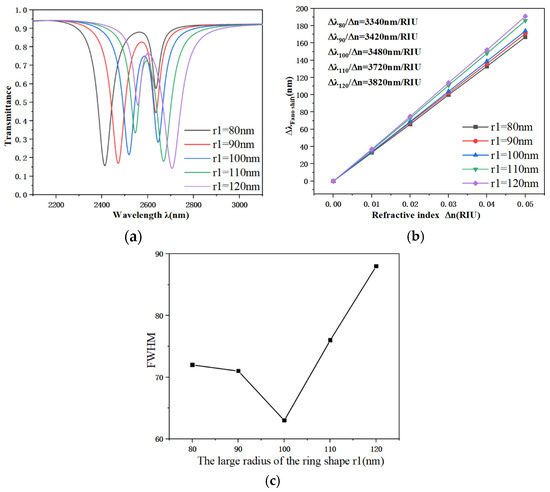 (a) Transmission spectra under different ring radii r1 of the URRCTR structure; (b) Corresponding linear fitting of sensitivity; (c) Variation of FWHM values at different heights of the ring radius.