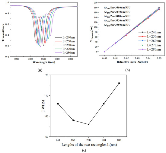 The lengths of the two rectangular cavities, denoted as L, were varied from 240 nm to 280 nm in increments of 10 nm, to further investigate the U-shaped resonator with the URRCTR structure. Figure 6a reveals a positive correlation between the resonant wavelength and the parameter L: an increase in L induces a notable red shift, indicating that active tuning of the spectral response can be achieved by adjusting L. This behavior is attributed to the increased effective refractive index of the optical resonator resulting from larger values of L, which modifies the resonant condition and leads to a displacement of the resonance wavelength, though it has limited effect on modulating the resonance depth. As illustrated in Figure 6b, the system sensitivity remains stable across the evaluated range of L, demonstrating insensitivity to changes in the rectangular cavity length. Figure 6c indicates that the FWHM first decreases and then increases with increasing L, reaching a minimum value of 63 nm at L = 260 nm. As L increases from 260 nm to 280 nm, the FWHM broadens significantly from 63 nm to 73 nm.