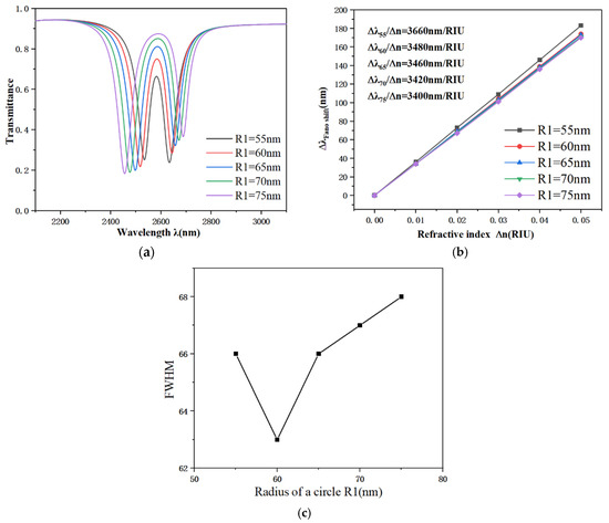 (a) The transmission characteristics of the URRCTR configuration with different circle radii; (b) Sensitivity fitting lines corresponding to different circle radii; (c) Variation of the FWHM at different values of the circle radius.