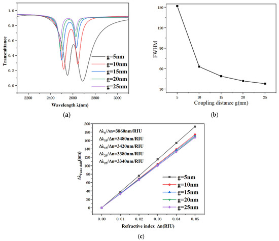 Lastly, the impact of the coupling gap g between the resonator and the waveguide on the sensing performance was comprehensively analyzed. Figure 8 shows the transmission spectra obtained under different values of g. While keeping the remaining design parameters constant, the coupling gap g was incrementally increased from 5 nm to 25 nm to analyze its effect on the spectral response and sensing characteristics. Analysis of Figure 8a indicates that as the coupling gap g increases, the transmission characteristics exhibit a notable blue shift, accompanied by an increase in transmission. The enlargement of the coupling gap reduces the coupling efficiency of surface plasmon waves, allowing more energy to be transmitted directly through the waveguide outlet and significantly weakening the electric field within the resonator. As shown in Figure 8b, this change is directly reflected in a reduction in the FWHM of the transmission profile, along with a corresponding decrease in electric field intensity within the resonant region. Therefore, the selection of the coupling distance g is critically important. As observed in Figure 8b, when g increases from 5 nm to 10 nm, the FWHM of the transmission spectrum decreases sharply. For coupling gaps larger than 10 nm, the rate of decrease in FWHM slows down. Although a sensitivity of 3860 nm/RIU was achieved at g = 5 nm, it resulted in a broad FWHM of 152 nm, limiting the figure of merit (FOM) to a relatively low value of 25.39. Thus, the coupling performance of the structure was compromised by the large FWHM. Figure 8c shows that as the coupling gap widens, the sensitivity decreases from 3860 nm/RIU to 3340 nm/RIU. Based on comprehensive evaluation, the optimal coupling gap is determined to be 10 nm. At this point, the designed refractive index sensor reaches a S of 3480 nm/RIU and a FOM of 55.23, which is better than the data in Table 3.