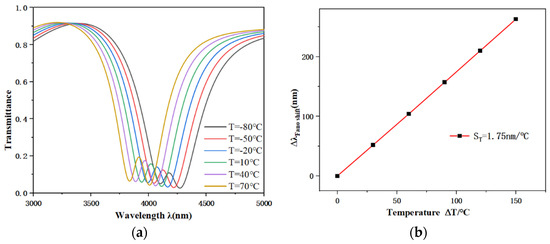 Within this temperature range, as indicated by Equation (5), the variation in the optical index of the designed structure spans from 1.34078 to 1.39988. According to Figure 9a,b, this change can be quantified by the red shift of the transmission dip from 4007 nm to 4270 nm, resulting in a resultant wavelength shift (Δλ) of 263 nm. The sensor’s sensitivity is determined to be 1.75 nm/°C, a value derived from the linear regression of the curve illustrated in Figure 9b, thereby ensuring the reliability of the measurement. This high sensitivity serves as a crucial indicator of exceptional temperature measurement performance, offering a dependable solution for various applications requiring precise thermal management. The practical fabrication of such precise gaps presents considerable challenges. While advanced techniques like electron beam lithography and focused ion beam milling are capable of creating sub-10 nm features in localized areas, they face critical hurdles in controlling surface roughness and avoiding material damage. These imperfections can introduce additional damping, thereby degrading the device’s quality factor. Consequently, limitations in nanofabrication currently lead to discrepancies between simulated and actual sensor performance. This gap, however, is expected to narrow with continued advancements in nanomanufacturing capabilities.