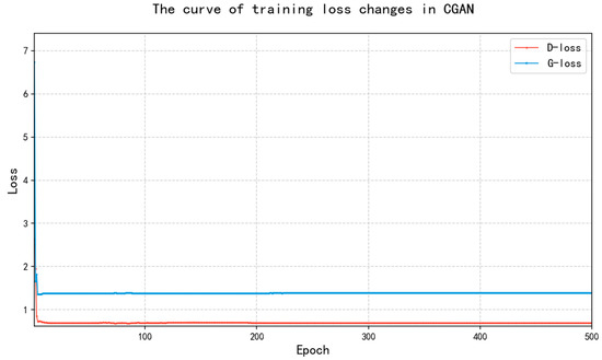 In the CGAN model, the generator receives a 100-dimensional Gaussian noise vector and labels. After expanding the dimensions through fully connected layers, the noise vector is concatenated with the labels along the channel dimension. The resulting vector is then upsampled to 800 points using 4 layers of Conv1D-BN-ReLU. Finally, the output is cropped to 789 points and passed through a Tanh activation function. The discriminator concatenates the spectrum with the corresponding label and extracts features through 2 layers of Conv1D with stride = 2 and LeakyReLU. After flattening, the output is passed through a sigmoid function to produce a probability score for authenticity. The loss function used is binary cross-entropy, and the optimizer is Adam. The learning rate is set to 0.0001, the batch size is 32, and the training consists of 500 epochs. During training, the discriminator and generator are updated alternately until the discriminator’s loss stabilizes at 0.68, and the generator’s loss stabilizes at 1.37. This adversarial optimization continues until both networks converge, producing high-quality synthetic data that is indistinguishable from real Raman spectra. The changes in the loss value during the training process are shown in Figure 3.
