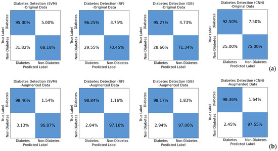 Confusion matrix for diabetes classification, (a) shows the classification results for the original data, while (b) presents the classification results for the augmented data. A notable improvement in classification performance is evident with the enhanced data. This offers a detailed insight into the model’s performance, enhancing the ability to distinguish between diabetic and non-diabetic patients.