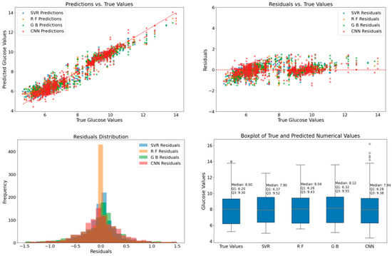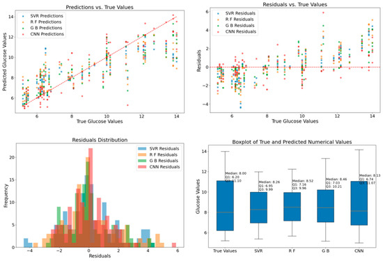 Figure 8 showcases the prediction results of different models on the dataset augmented by CGAN. Through the same visual means, the impact of data augmentation on the prediction performance of the models can be evaluated. In the detection of the augmented dataset, the prediction data of each model presents a significantly more concentrated distribution state, and most of the prediction points are closely clustered around the line segment representing the true values. This change vividly demonstrates the positive effect of the data augmentation strategy. The data generated by CGAN enriches the diversity of the original dataset and supplements the key pattern information, enabling the models to better understand the data patterns and generate more compact and stable prediction results, significantly improving the accuracy and stability of the predictions. The residual plot and the residual histogram show that the error range is significantly reduced and concentrated within the interval of [−1.5, 1.5]. This indicates that after data augmentation, the models can more sensitively capture the subtle features in the data, fit the true values more closely during prediction, have smaller and more stable errors, and reduce the occurrence of large errors caused by the complexity of the original data. The box plot shows that the median of the true data is 8, the first quartile (Q1) is 6.20, and the third quartile (Q3) is 9.3. The medians of the prediction results of each model are close to the median of the true data, and the ranges of the quartiles show a better degree of fitting, indicating that each model has achieved significant improvements in prediction accuracy and stability after data augmentation.