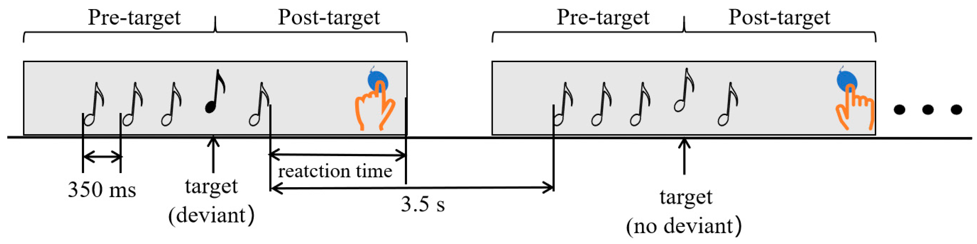 - Florin, E.; Vuvan, D.; Peretz, I.; Baillet, S. Pre-target neural oscillations predict variability in the detection of small pitch changes. PLoS ONE 2017, 12, e0177836. [Google Scholar] [CrossRef] [PubMed]