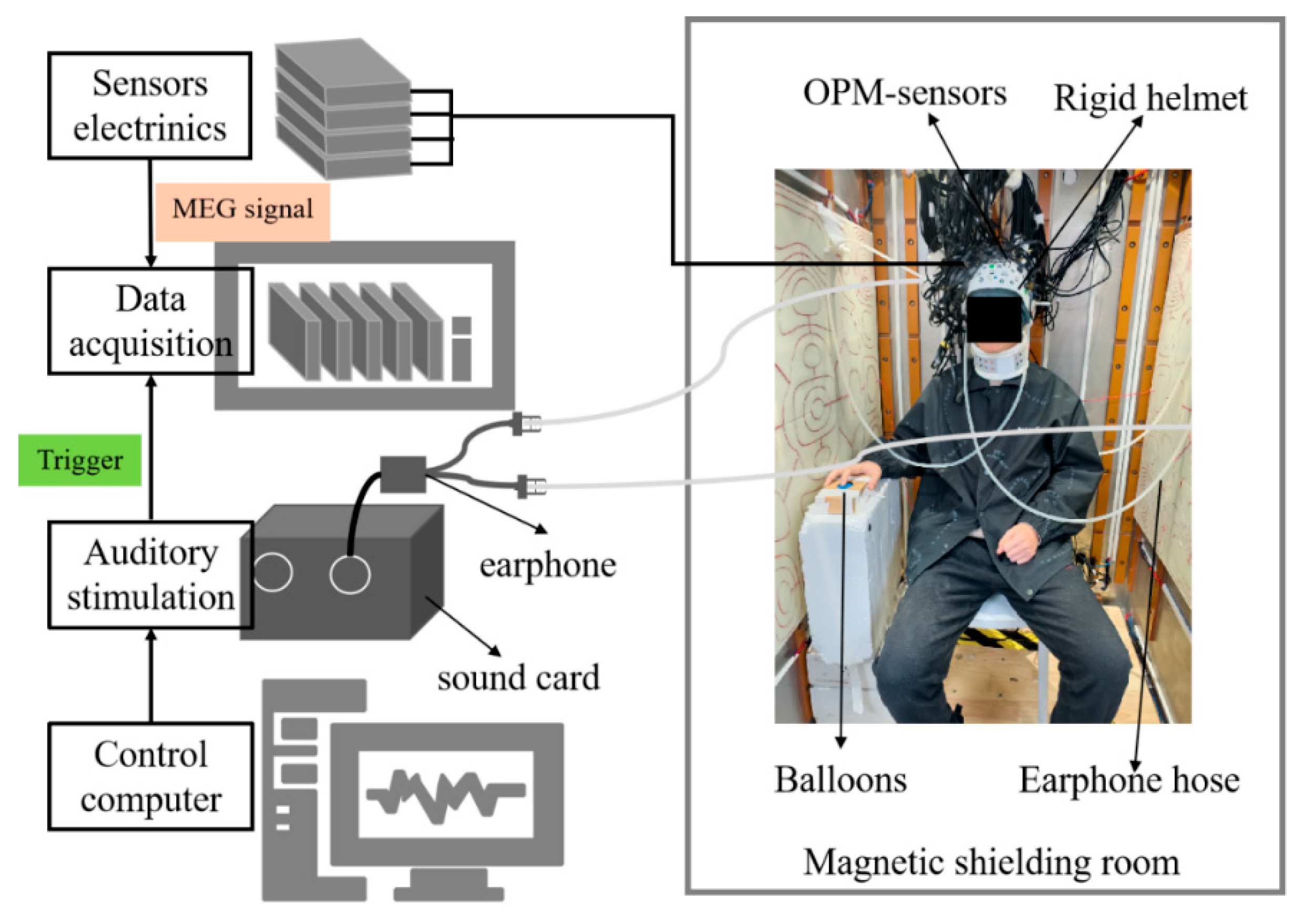 - Xu, W.; Liao, P.; Cao, M.; White, D.J.; Lyu, B.; Gao, J.-H. Facilitating cognitive neuroscience research with 80-sensor optically pumped magnetometer magnetoencephalography (OPM-MEG). NeuroImage 2025, 311, 121182. [Google Scholar] [CrossRef] [PubMed]