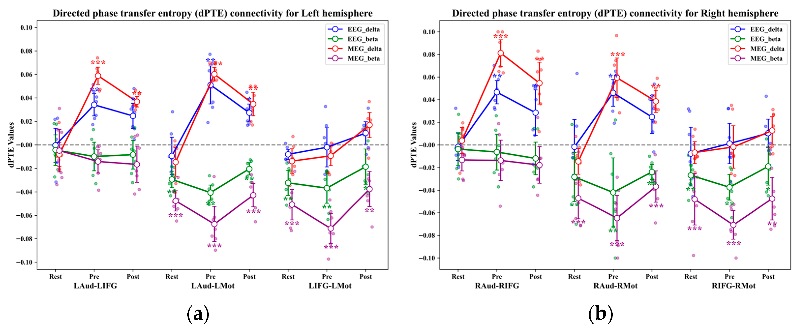 - Mantegna, F.; Orpella, J.; Poeppel, D. Time-resolved hemispheric lateralization of audiomotor functional connectivity during covert speech production. Cell Rep. 2025, 44, 115137. [Google Scholar] [CrossRef]