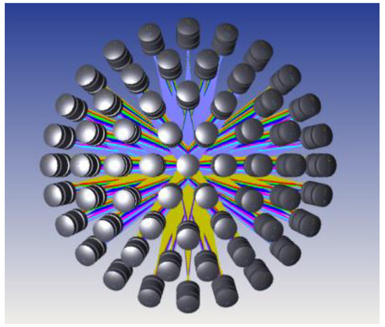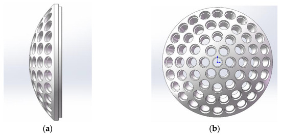 The designed individual sub-apertures are arranged on a curved substrate according to the curved circumferential arrangement model, forming the curved multi-aperture array. Each sub-aperture has the same focal length, and the curved focal surface images they form are concentric with the substrate. Figure 6 shows the physical model diagram of the curved multi-aperture array. As illustrated, the array consists of a five-layer circumferential annular structure, with 9 sub-apertures along the primary array direction, totaling 61 sub-apertures for the entire array. Calculation using Equation (2) shows that the curved multi-aperture array is arranged on a curved substrate with a radius of curvature of 75 mm. The axial length of each sub-aperture is 15 mm; consequently, the curved focal surface image formed by the curved multi-aperture array is distributed on a curved surface with a radius of curvature of 60 mm.