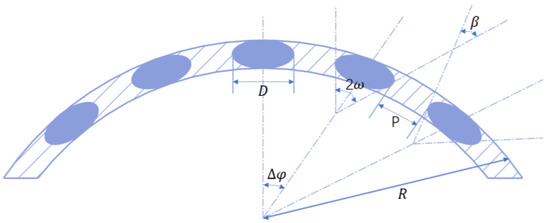 Based on the structural characteristics of the curved circumferential arrangement model and the geometric relationship between the parameters, the following formulas can be derived: