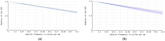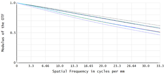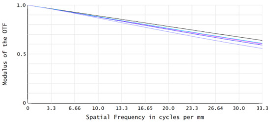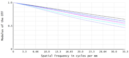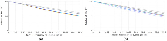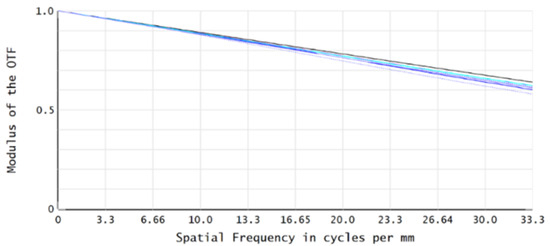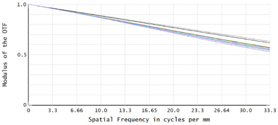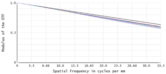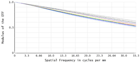 Figure 11, Figure 12, Figure 13, Figure 14 and Figure 15 display the MTF curves for each sub-aperture channel at the characteristic frequency of 33.3 lp/mm. As shown in the figures, the MTF curves all approach the diffraction limit. This demonstrates that the designed compound-eye system achieves good imaging quality both on-axis and at the edge, satisfying the design requirements.