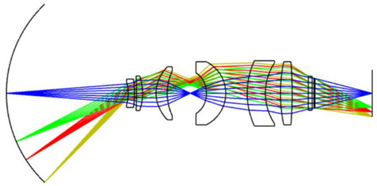 The designed optical system for a single sub-aperture consists of three lenses, with the lens materials selected as commonly used zinc sulfide (ZnS), silicon (Si), and chalcogenide IRG-series glass. The outer diameter of each sub-aperture is 8 mm, and the weight of a single sub-aperture is 1.32 g. The optimized optical path diagram of a single sub-aperture is shown in Figure 4.