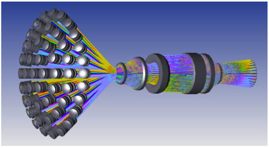 When integrating the designed curved multi-aperture array with the relay imaging system, the pupil connection principle must be followed to ensure favorable imaging performance for the overall system. This requires the exit pupil position of the curved multi-aperture array to coincide with the entrance pupil position of the relay imaging system. After integration, the system forms a complete compound-eye optical system, and the aberrations of the entire optical path are comprehensively optimized and balanced to ensure the image quality of all sub-apertures meets the design requirements. The physical model of the optimized compound-eye optical system is shown in Figure 9.