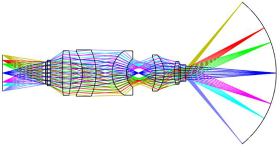 The FOV of the multi-aperture bionic compound-eye optical system is formed by stitching together the FOVs of individual sub-apertures. Therefore, image quality analysis is required for different sub-aperture channels. Since all sub-aperture parameters are identical and the entire system possesses rotational symmetry, only the imaging quality of five sub-aperture channels along a primary array direction (as illustrated in Figure 10) is analyzed below. The rotation angles of the optical axes of these sub-aperture optical systems relative to the optical axis of the central sub-aperture are 0°, 10°, 20°, 30°, and 40°, respectively.