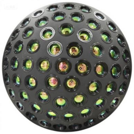 To validate the imaging performance of the designed curved bionic compound-eye optical system, a prototype is fabricated according to the aforementioned design scheme. Figure 20 and Figure 21 show the curved substrate spherical shell diagram and the overall assembly diagram of the compound-eye system prototype, respectively. To comprehensively evaluate the system performance, laboratory testing and field testing are conducted to validate the system’s performance in multiple dimensions, including FOV coverage, distortion control, thermal sensitivity, and dynamic target detection. All experimental images are captured by the prototype, ensuring the authenticity and reliability of the verification results.