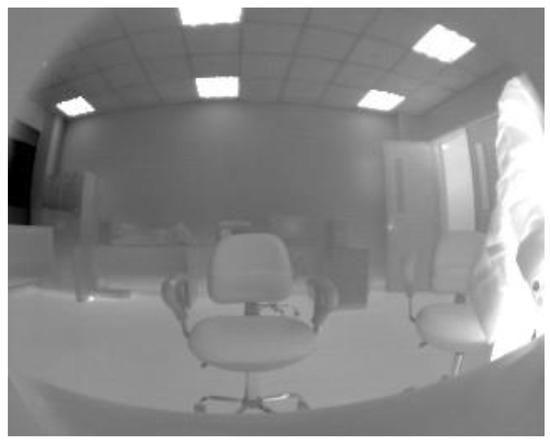 A laboratory scene is captured by the compound-eye system, and the result is shown in Figure 23. Straight structures in the image, such as ceiling lines and bookshelf edges, remain straight even at the edge of the FOV, with no significant barrel or pincushion distortion observed. To highlight the advantages of the proposed system, a comparison is made with an image captured by an existing single-aperture medium-wave infrared wide-angle airborne lens with a 108° × 90° FOV (Figure 24). The comparison reveals that the image from the single-aperture lens exhibits noticeable straight-line distortion at the edge of the FOV, whereas the compound-eye system demonstrates superior distortion control capability while maintaining a large FOV.