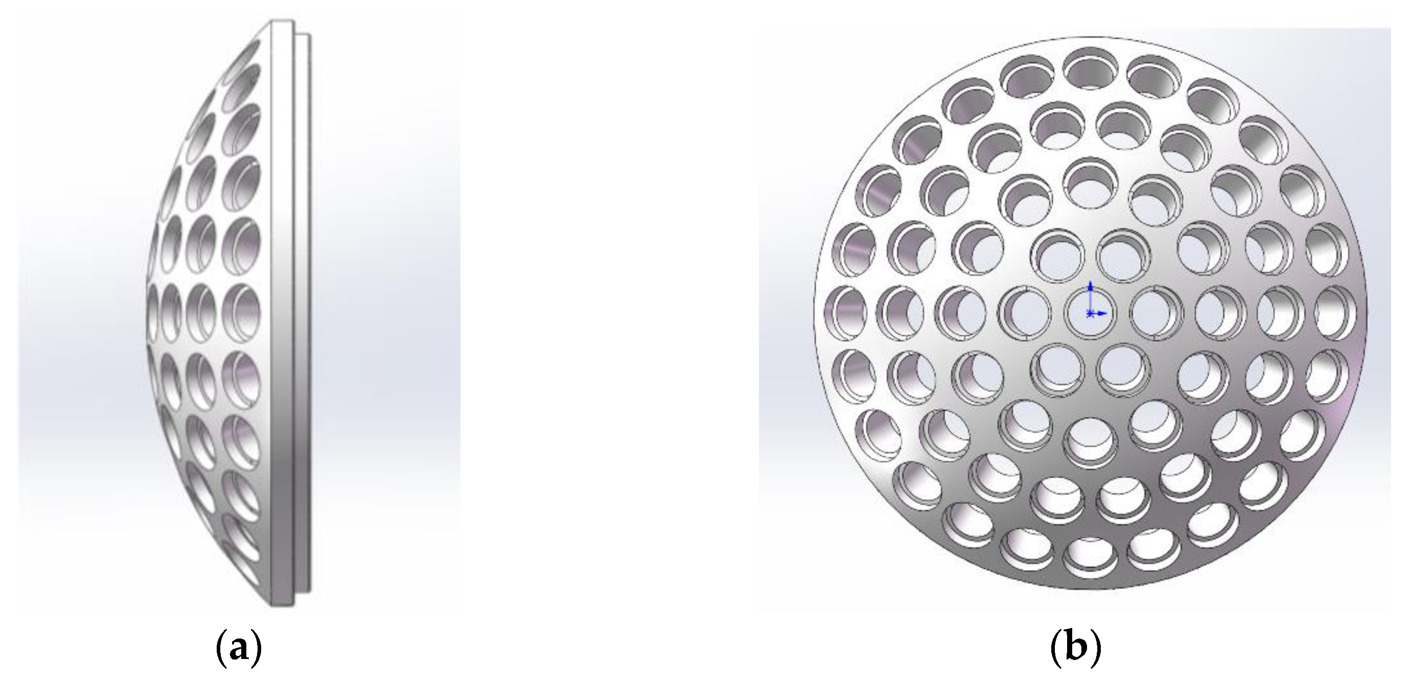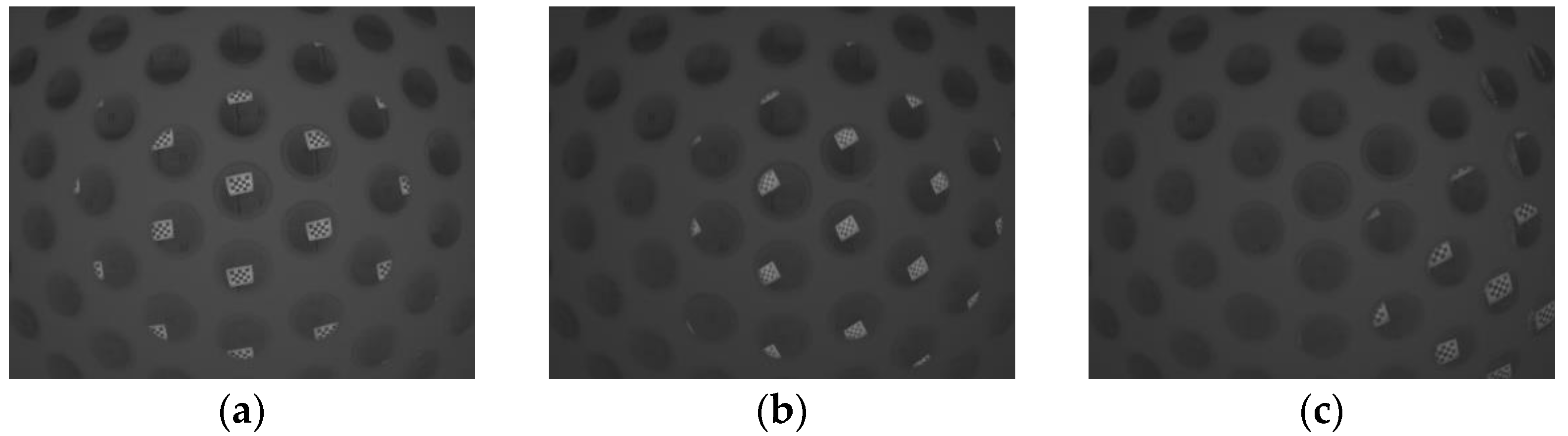 Figure 6 shows the physical model diagram of the curved multi-aperture array. As illustrated, the array consists of a five-layer circumferential annular structure, with 9 sub-apertures along the primary array direction, totaling 61 sub-apertures for the entire array. Calculation using Equation (2) shows that the curved multi-aperture array is arranged on a curved substrate with a radius of curvature of 75 mm. The axial length of each sub-aperture is 15 mm; consequently, the curved focal surface image formed by the curved multi-aperture array is distributed on a curved surface with a radius of curvature of 60 mm.