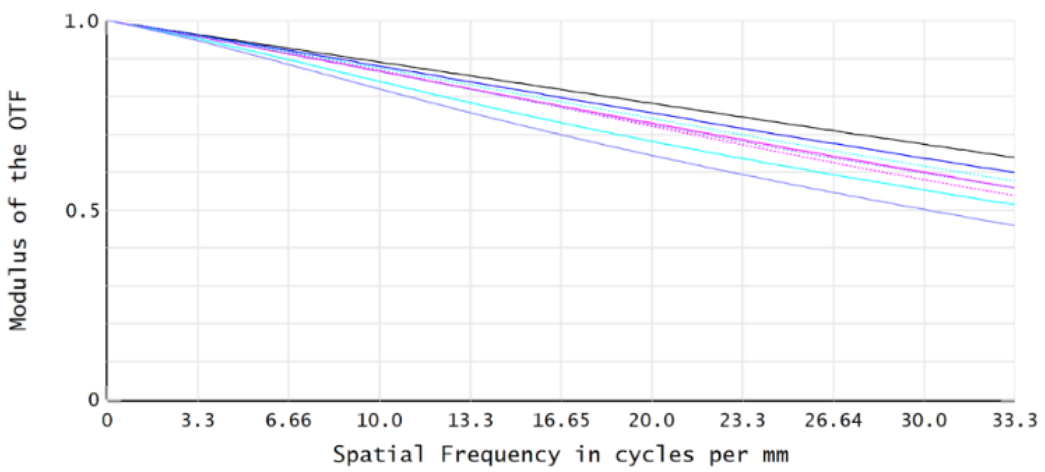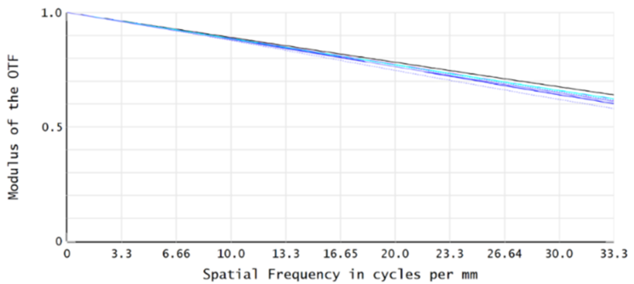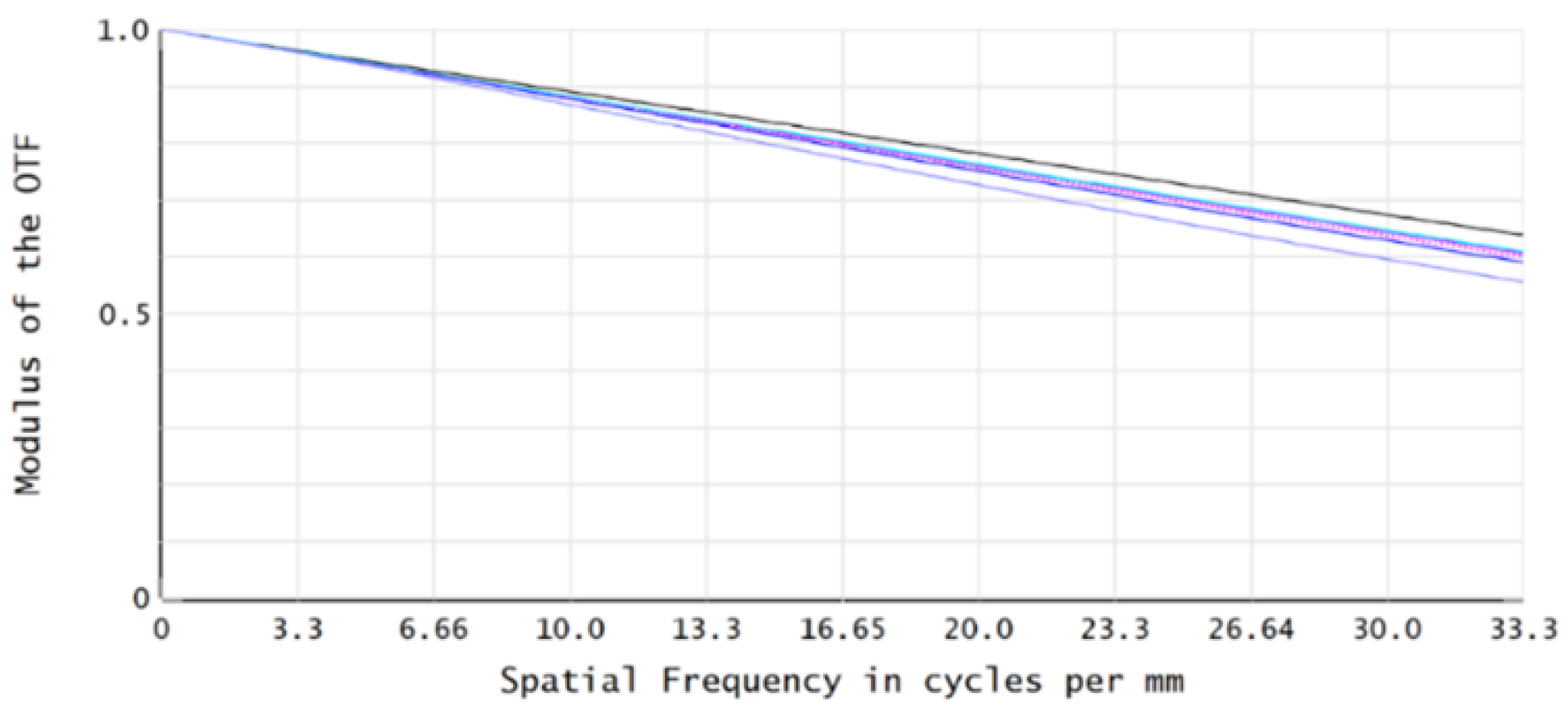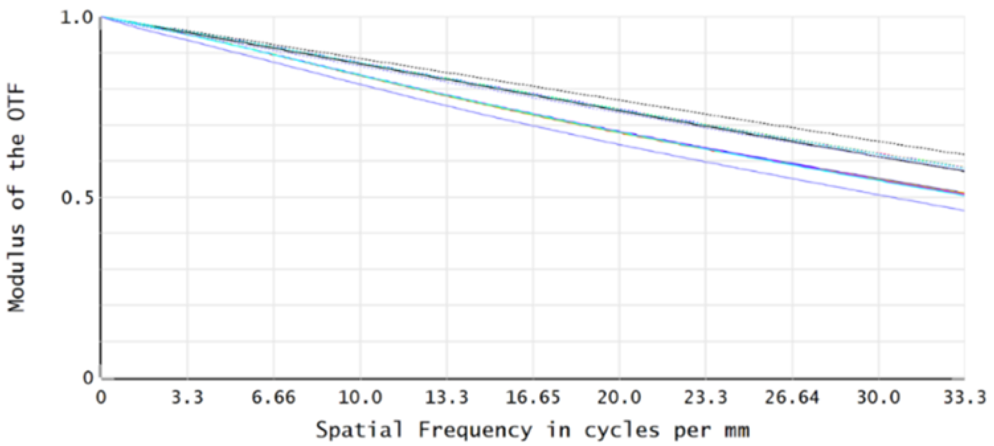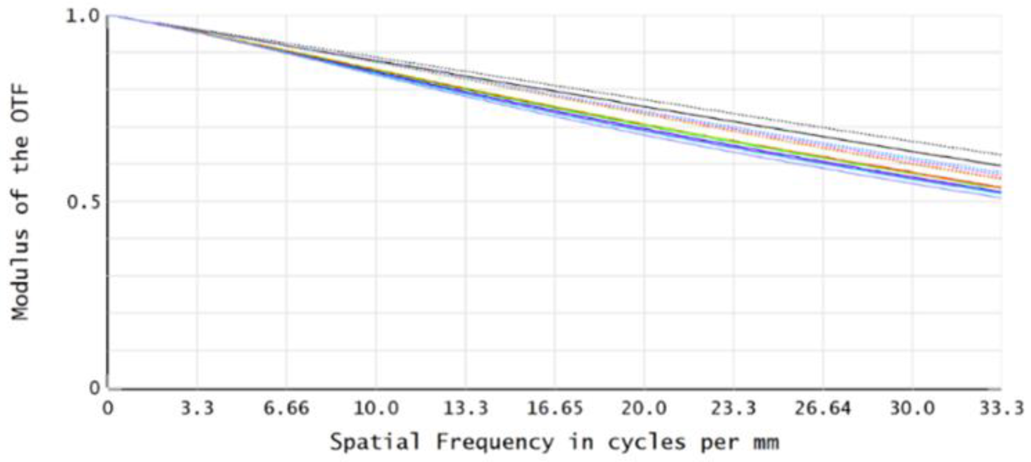 Figure 8. The MTF values across all FOVs are greater than 0.46 at the characteristic frequency of 33.3 lp/mm, meeting the imaging quality requirements.