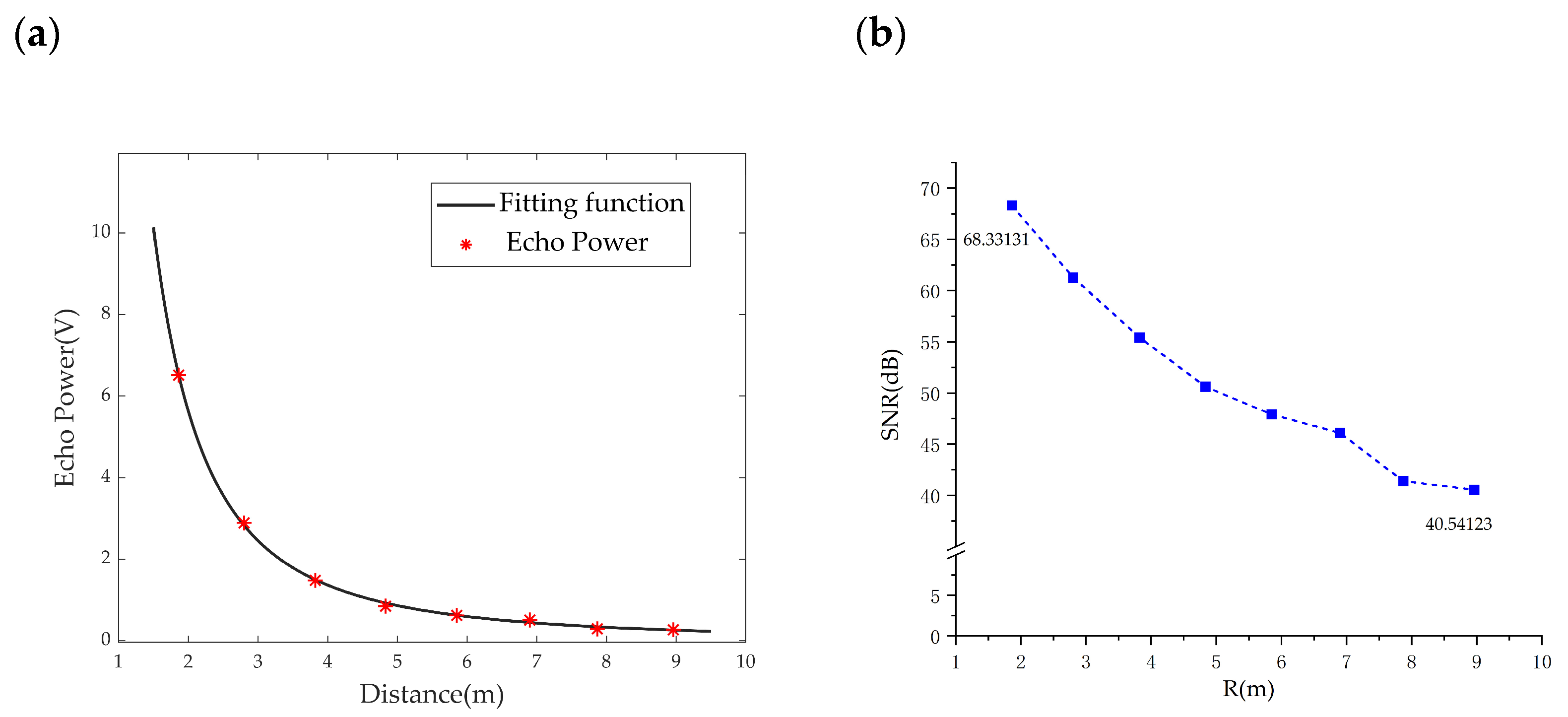Figure 4a presents the system’s echo signal power, demonstrating a proportional relationship to 1/R
