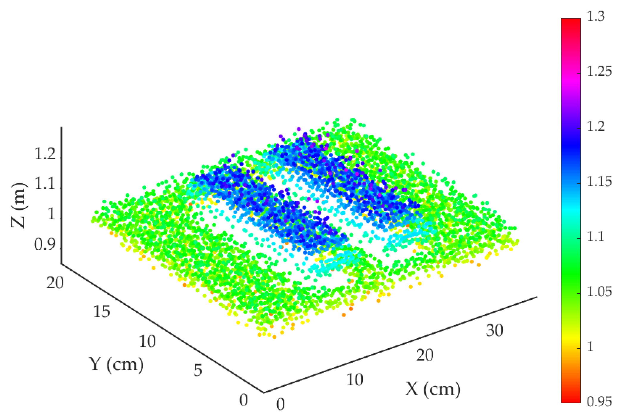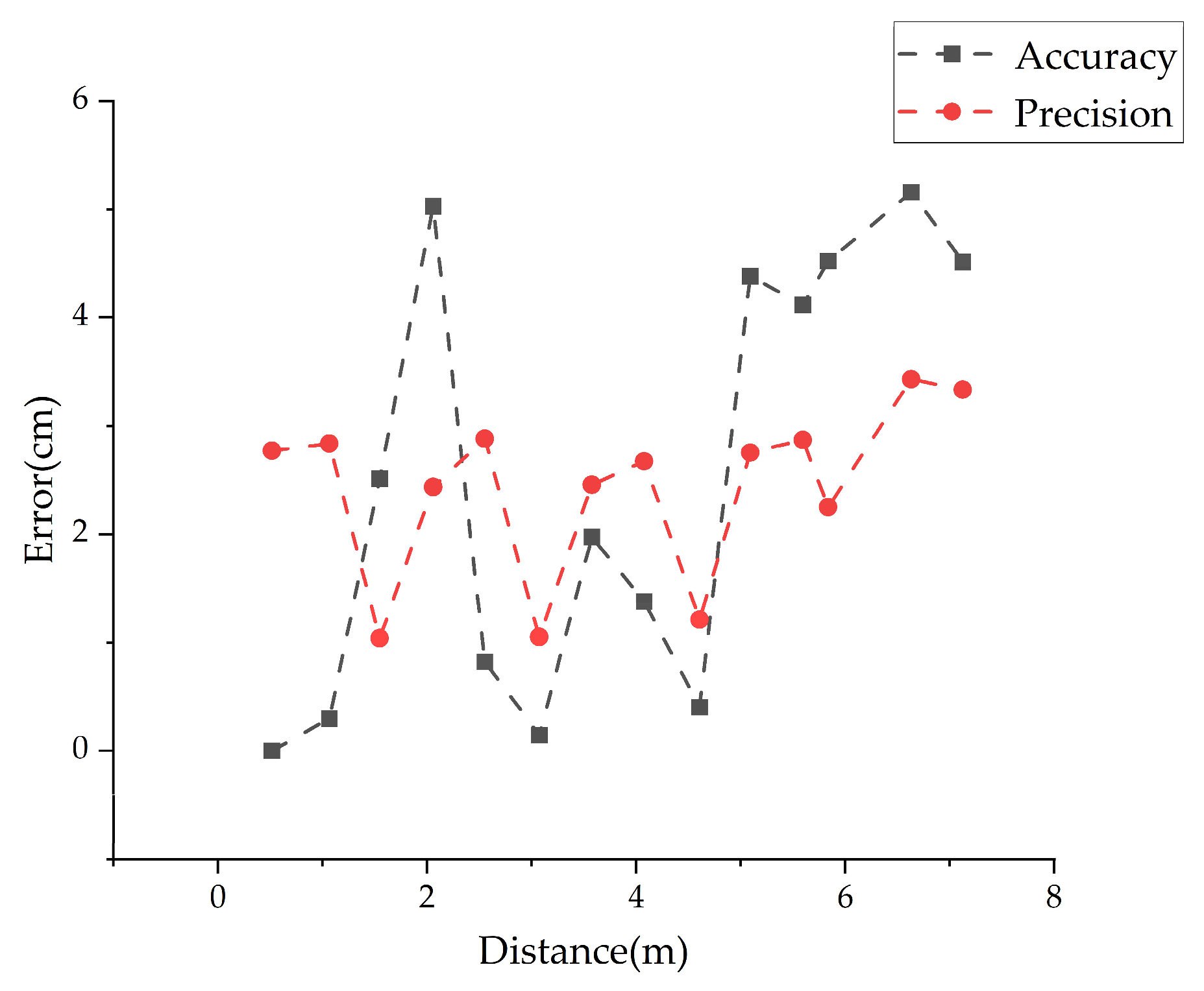 Figure 6 displays the test results. The maximum precision error is 3.4 cm, while the maximum accuracy error reaches 5.1 cm. The observation reveals a correlation where the error increases as the echo signal strength decreases, which is caused by the walk error of the pulse signal [